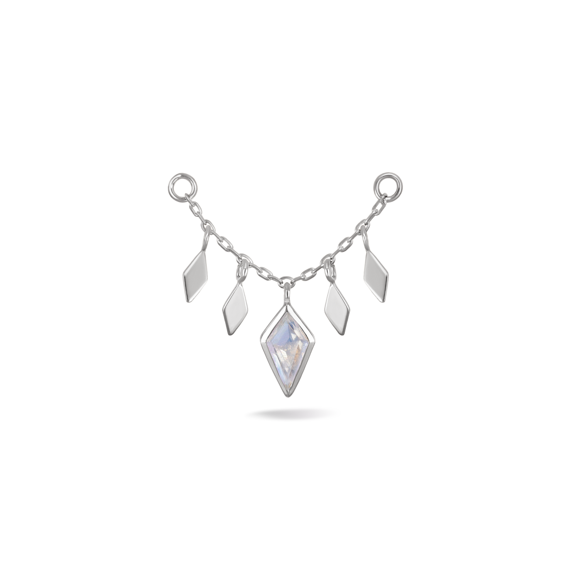The 'Patra' chain showcases a striking design with a genuine kite-cut Rainbow Moonstone at its center, paired with sleek rhombus-shaped gold plaques. The bold geometric accents and the moonstone's natural shimmer make this piece truly stand out. With two jump rings, it offers versatile styling options for a personalized look, whether worn front-to-back, side-to-side, or across multiple piercings. A unique piece crafted with precision and care. MEASUREMENTS Chain Length: 22mm (wearable length excluding two jump rings) Jump Ring Inner Diameter: 1.7mm Designed to fit up to 16G (1.2mm thickness) Earring Post Stone Size: 4mm (W) × 7mm (L) MATERIALS 14K Solid Gold Gemstone: Rainbow Moonstone